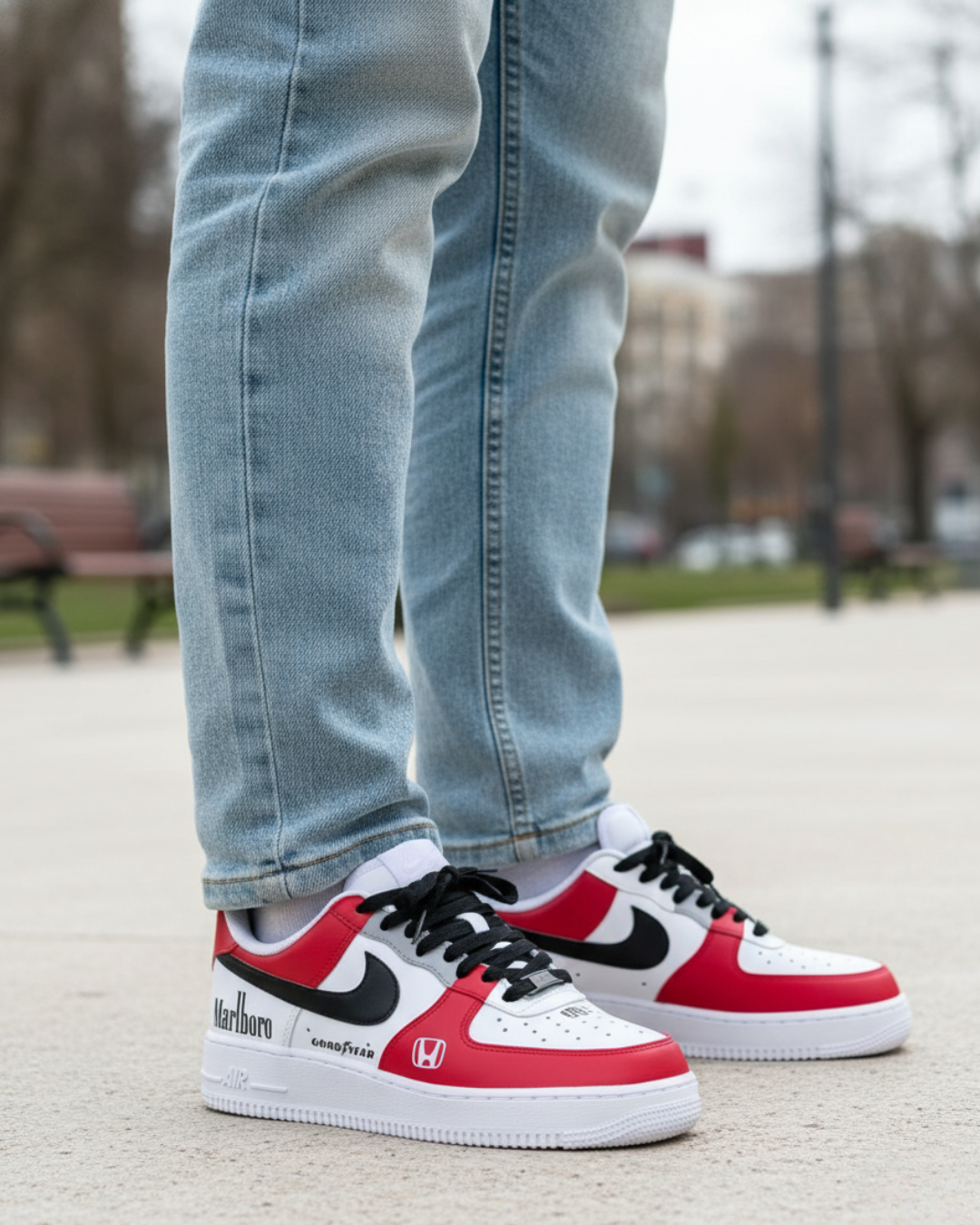 Designed for everyday wear, the Custom Nike Air Force Marlboro Racing Team blend style, comfort, and personality. With soft cushioning and a durable sole, these shoes are perfect for daily wear or display in any custom shoe collection. Available in EU unisex sizes 36–46, they’re ideal for collectors, racing fans, or anyone ready to turn heads with motorsport-inspired footwear.
