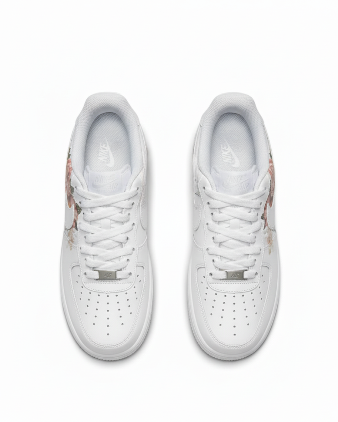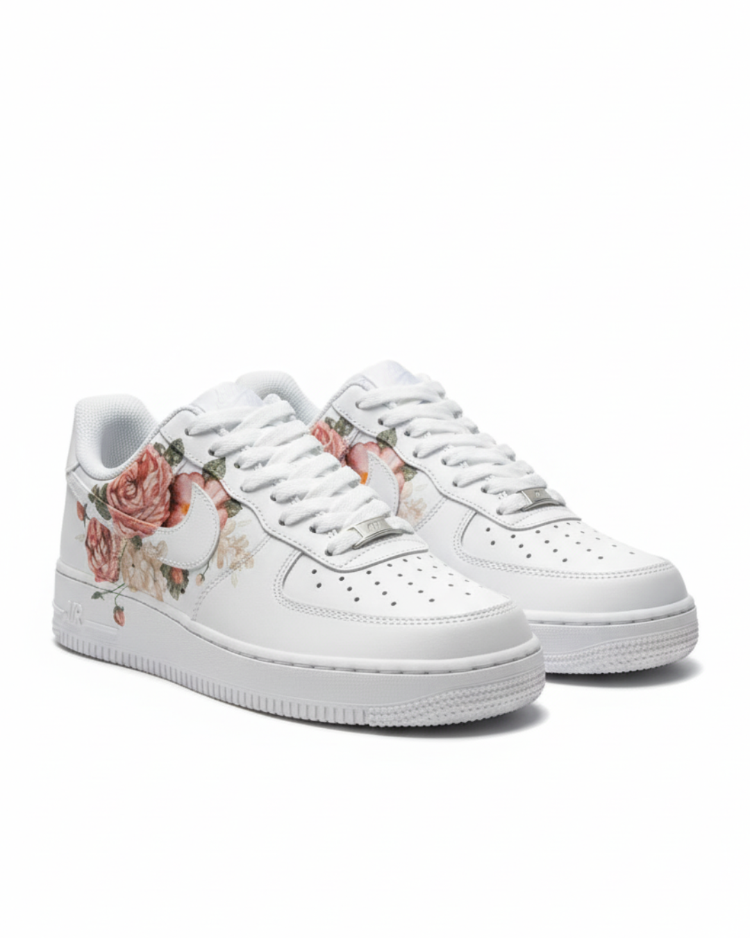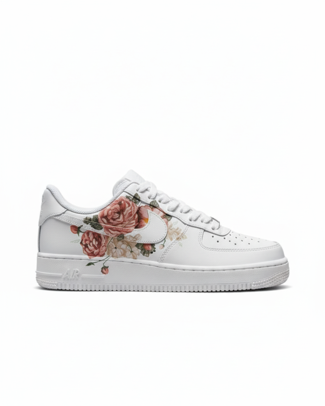Bring floral elegance to every step with the Custom Nike Air Force Rose Garden by Brush and Sole — where artistry meets style.